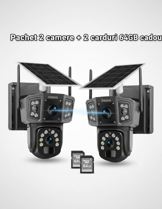 Set 2 x Camera Supraveghere Solara Dubla INNOVA WIFI , 6MP , Full HD, PTZ 360°, baterie 12000mAh, vedere nocturna, audio bidirectional, O-KAM PRO, 3 ani garantie + 2 card 64gb Cadou